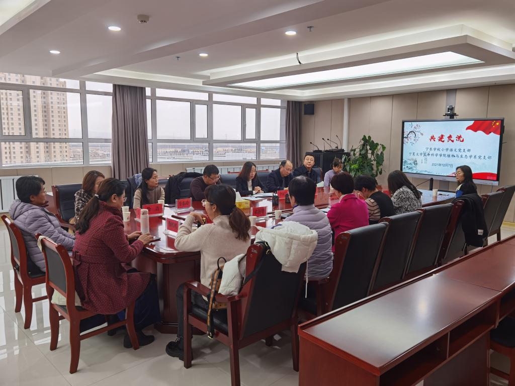 参观结束后,在宁东学校党员活动室双方开展了“聚焦多办实事,共促人才培养”主题党日活动。活动中,学院党委书记李东宁介绍了学院党建工作开展情况及取得的成效。生物科学(师范)专业负责人梁文裕教授介绍了新一轮人才培养背景和要求,并就相关问题向宁东学校生物课程组教师征求了意见。植物与生态学系植物生物学教研室牛东玲老师介绍了教研室建设情况。随后,宁东学校副校长梁金霞介绍了宁东学校党建工作开展情况,针对中学生物教师教学应具备的理论知识框架和实践教学能力提出了建设性意见;副校长贾艳霞介绍了宁东学校教育教学情况及经验。经过交流,双方均表示今后在党支部共建、师范专业学生实习、宁东学校课外科普及学生研学活动等方面建立深入的合作关系,共同促进双方相关工作的进一步开展及学生培养。