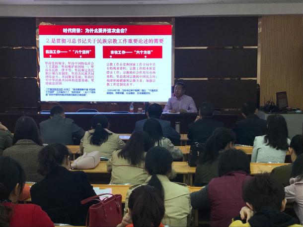 学院特邀宁夏大学宣讲团成员、政法学院副院长、中国宗教学会理事、宁夏回族学会理事吕耀军教授作为本次讲座主讲人,为全院教职工做民族团结进步教育专题辅导。吕教授主要从认识民族团结进步的重大意义、准确把握民族宗教工作的精神实质、全面并深度解读自治区党委十二届四次全会精神三个方面进行了讲解。宣讲内容理论与实际紧密结合,内容丰富,信息量大,生动而又不失深度。