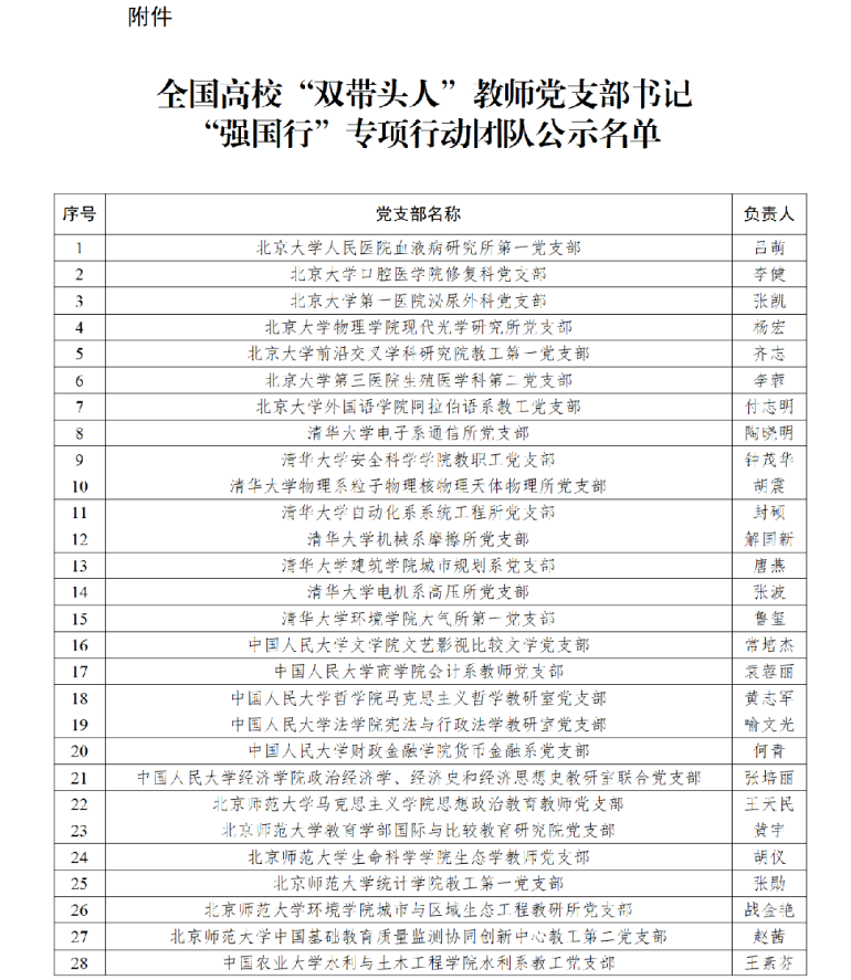 根据《教育部办公厅关于开展高校“双带头人”教师党支部书记“强国行”专项行动的通知》(教思政厅函〔2024〕11号)要求,经各高校党委审核把关、省级党委教育工作部门择优推荐、专项行动办公室备案审核,遴选产生全国高校“双带头人”教师党支部书记“强国行”专项行动团队名单,现将名单予以公示(见附件)。