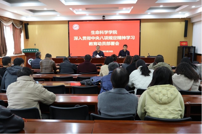 为深入贯彻中央八项规定精神,进一步加强学院党风廉政建设,推动全面从严治党向纵深发展,生命科学学院于3月28日在文萃校区知本楼二楼会议室召开深入贯彻中央八项规定精神学习教育部署会。学院全体党员参加,会议由学院党总支书记邓光存主持。