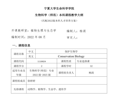 1、编写修订了基于OBE理念及课程思政目标的《保护生物学》课程教学大纲,已纳入2022版生命科学学院人才培养方案。