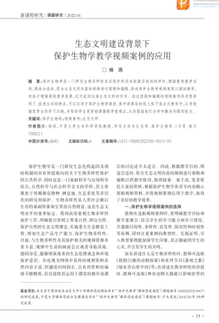 课程思政建设受到了宁夏大学课程思政示范课程建设项目《保护生物学》(宁大党发〔2018〕54号)以及宁夏回族自治区高校思想政治工作质量提升工程项目 “课程思政”精品项目(NXSZ20203067)的资助建设。